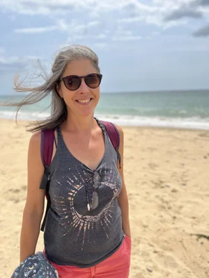 Pale blue fabric - from a smock she’d made for me as a baby to protect my clothes at mealtimes. She’d laugh telling me how much I loved to squish my food between my fingers and how I’d be covered in it after my dinner!. I have a remnant of it that still has her annotations written with biro in her signature-style, messy handwriting.